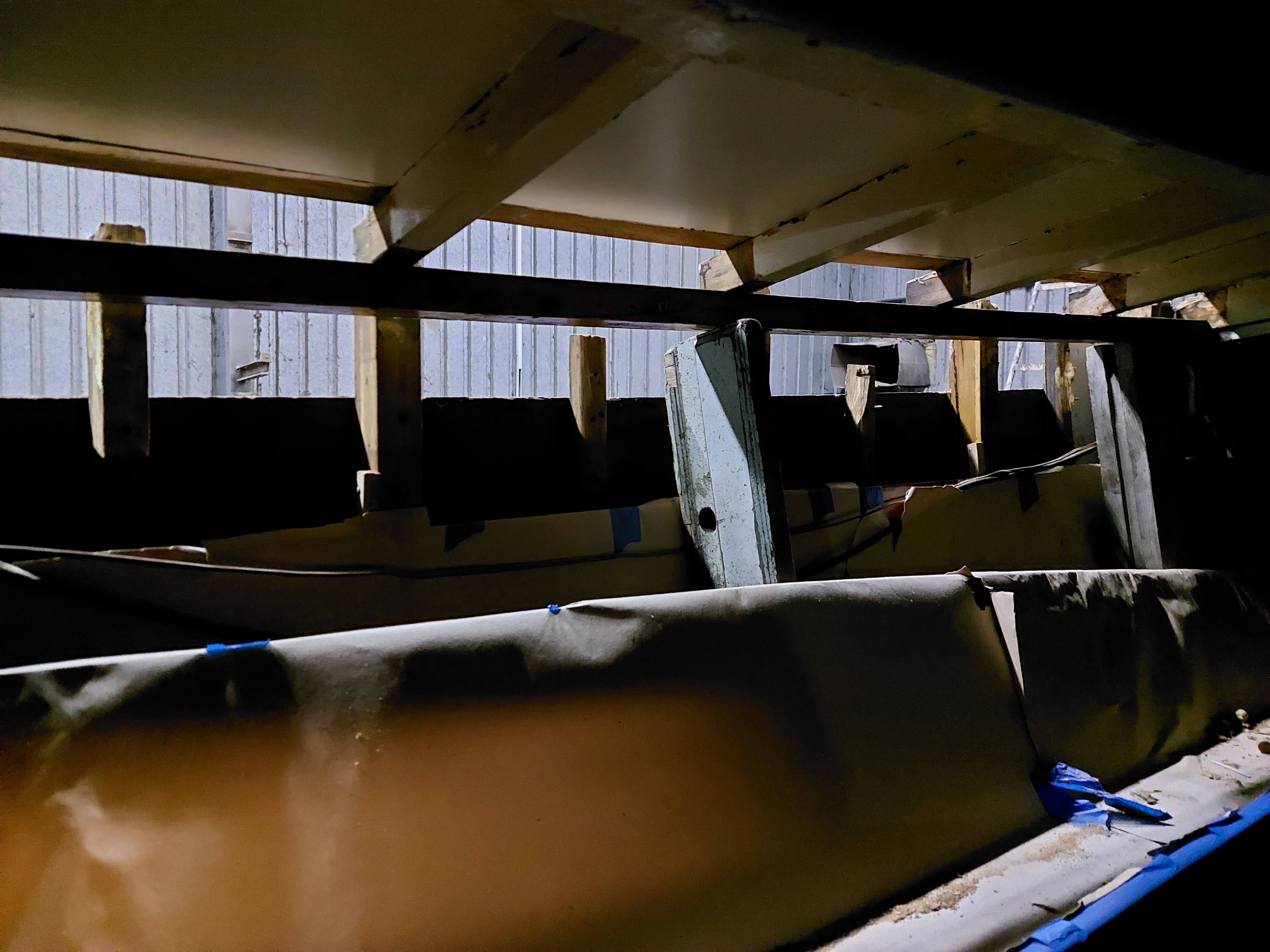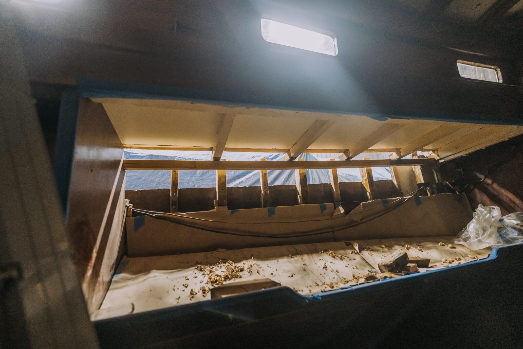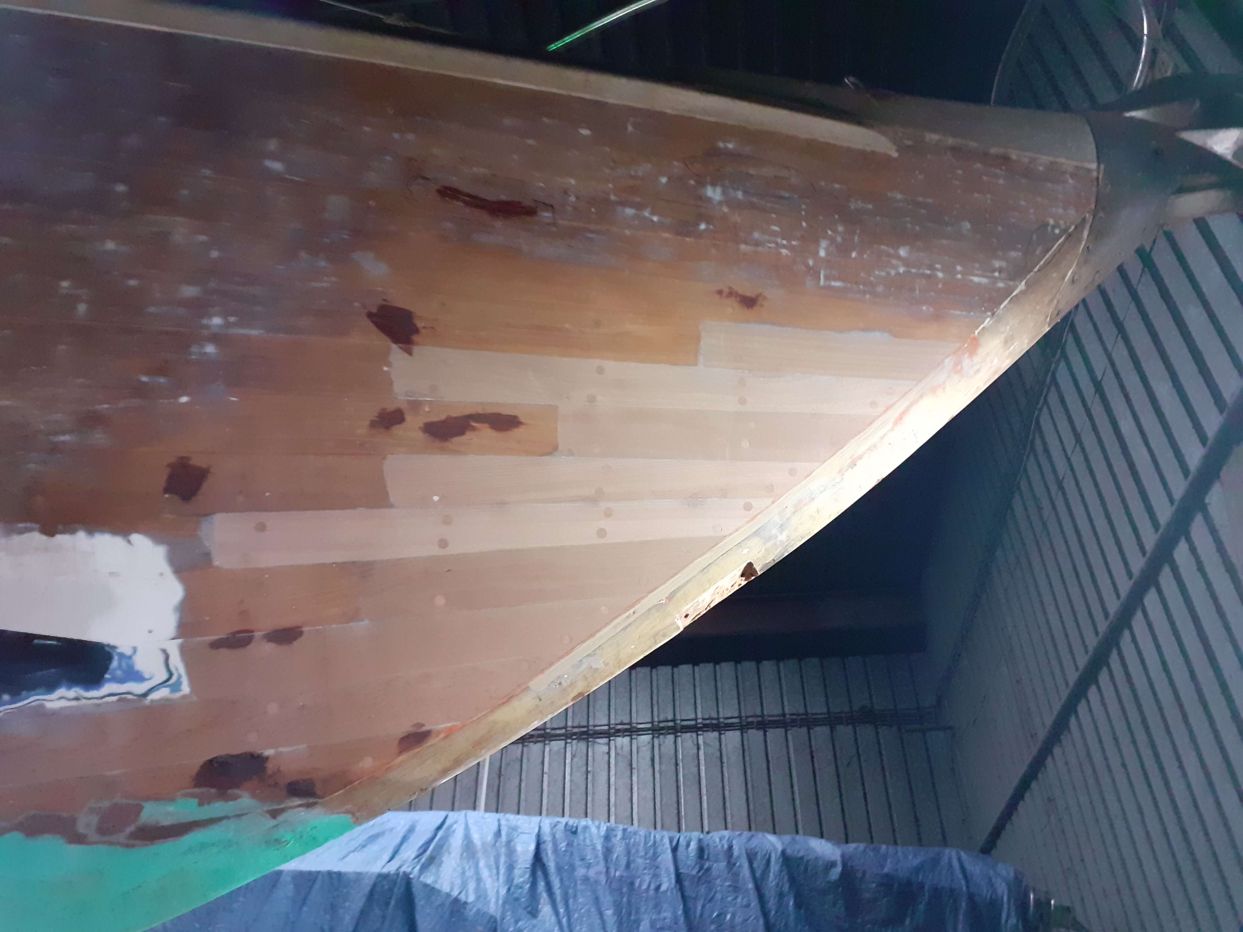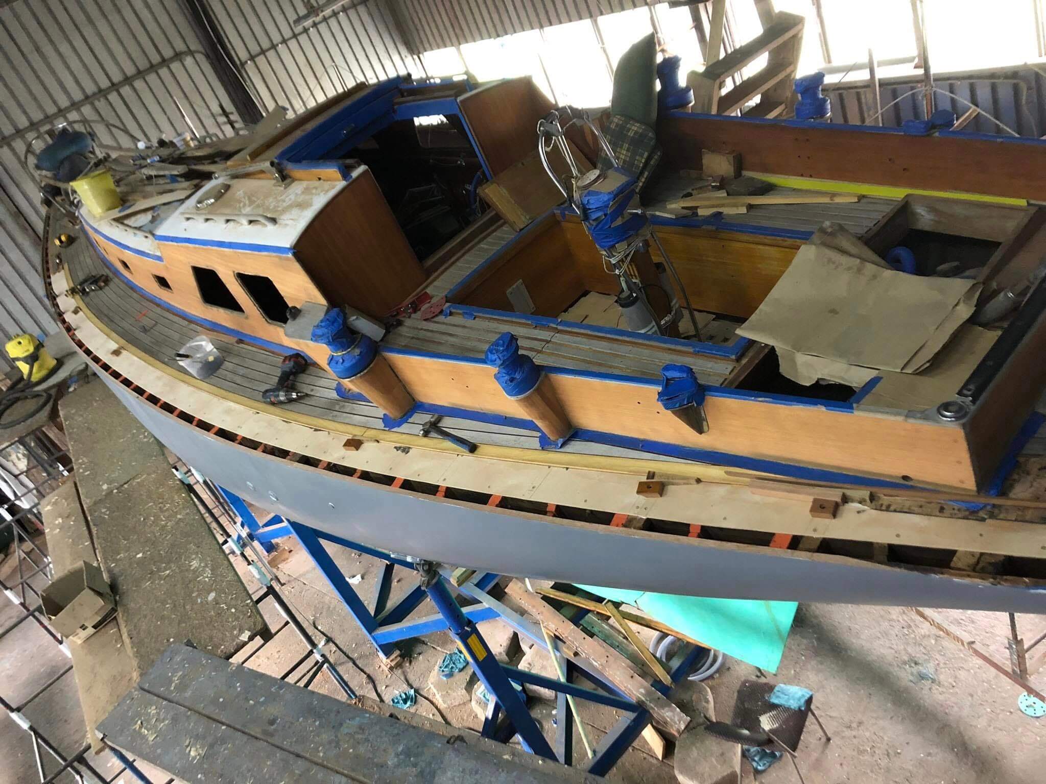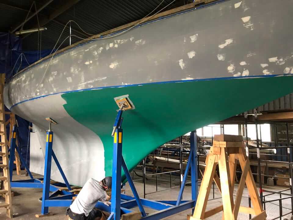Ada Osińska przyglądająca się burcie jachtu Cleo podczas prac remontowych.